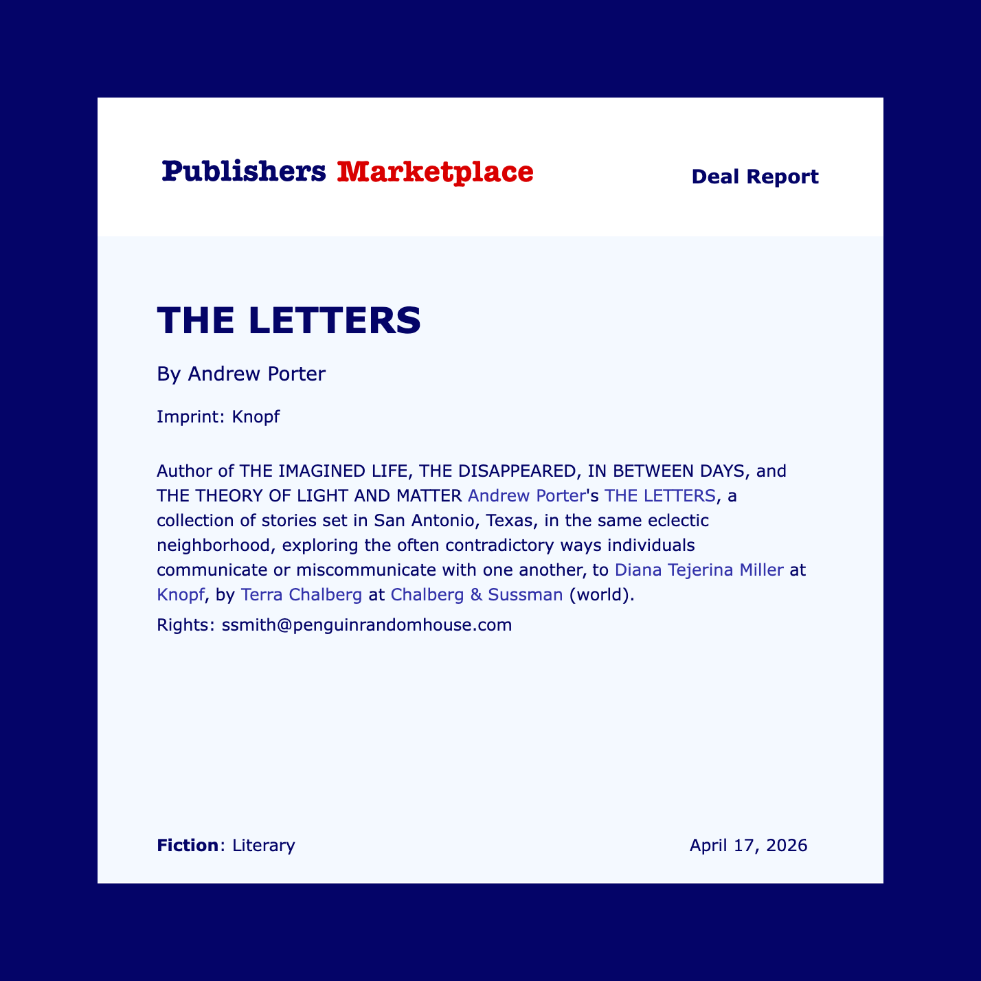 Absolutely thrilled to share that my new short story collection, THE LETTERS, will be published by Knopf next spring! I’m so grateful to be working again with my brilliant editor, Diana Tejerina Miller, as well as the rest of the amazing team at Knopf! I also want to express my gratitude to Trinity University, Trinity University School of Arts and Humanities, Trinity University Department of English, and the City of San Antonio Department of Arts & Culture for their support during the writing of this book. Check back soon for more info about the official publication date.