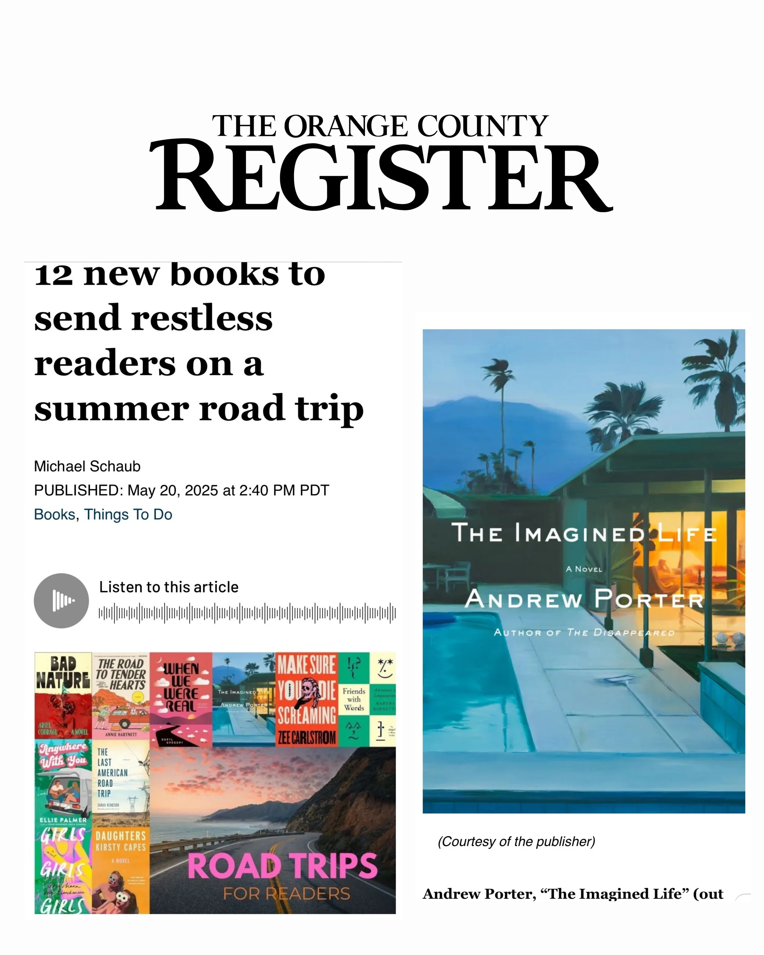 Excited to see my novel The Imagined Life included among these road trip books for summer by the Orange County Register!